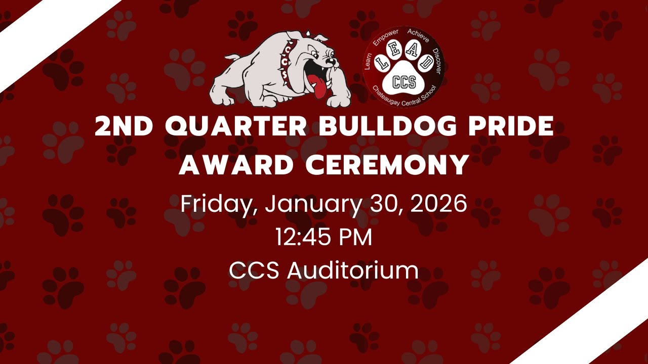 Please join us on Friday, January 30, at 12:45 PM for the 2nd Quarter Bulldog Pride Award Ceremony. The event will be livestreamed on the district's YouTube channel. The livestream can be accessed through the district's website or via the link below.